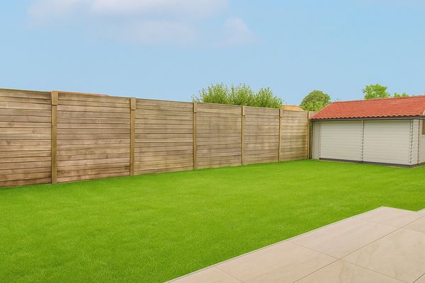 Buiten geniet je van een volledig omheinde, zonnige tuin die zorgt voor rust en veiligheid. De tuin wordt verkocht in huidige staat, maar een renderfoto geeft een inspirerend beeld van het potentieel. De ruime oprit biedt bovendien plaats voor twee wagens.