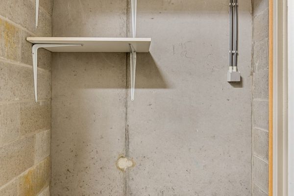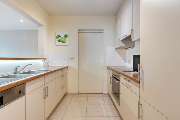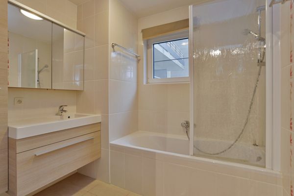 Vanuit de keuken heeft u toegang tot de berging waar de aansluiting voor de wasmachine en droogkast is voorzien. In de hal bevindt zich het gastentoilet en berging/vestiairekast. De badkamer is voorzien van een ligbad met een glazen douchewand, maatkasten en lavabo. De twee ruime slaapkamers hebben elk toegang tot het terras achteraan van maar liefst 32 m². De slaapkamers zijn ook voorzien van elektrisch bediende rolluiken. Verder is er een kelderberging die voorzien is van elektriciteit. De ondergrondse individuele garagebox van 14,20m² is aan te kopen aan 30.000 euro.