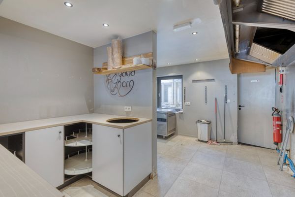 Bij het betreden van het pand kom je terecht in de ruime eetruimte met een gastentoilet. Achteraan bevindt zich de volledig uitgeruste professionele keuken, die toegang biedt tot de koer. Aansluitend vinden we twee met elkaar verbonden ruimtes, die uitstekend kunnen worden omgevormd tot een woongedeelte of extra polyvalente ruimte.