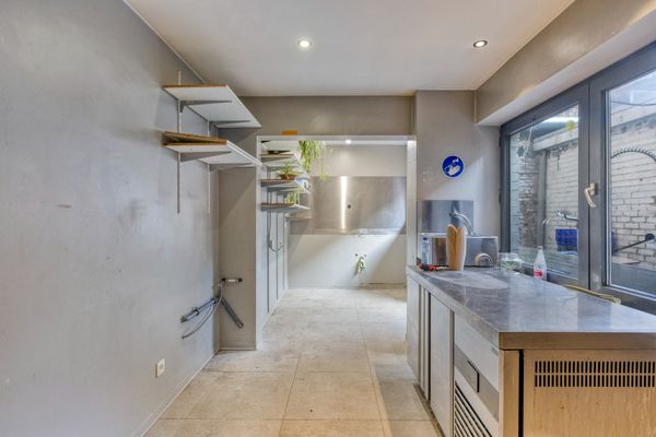 Bij het betreden van het pand kom je terecht in de ruime eetruimte met een gastentoilet. Achteraan bevindt zich de volledig uitgeruste professionele keuken, die toegang biedt tot de koer. Aansluitend vinden we twee met elkaar verbonden ruimtes, die uitstekend kunnen worden omgevormd tot een woongedeelte of extra polyvalente ruimte.